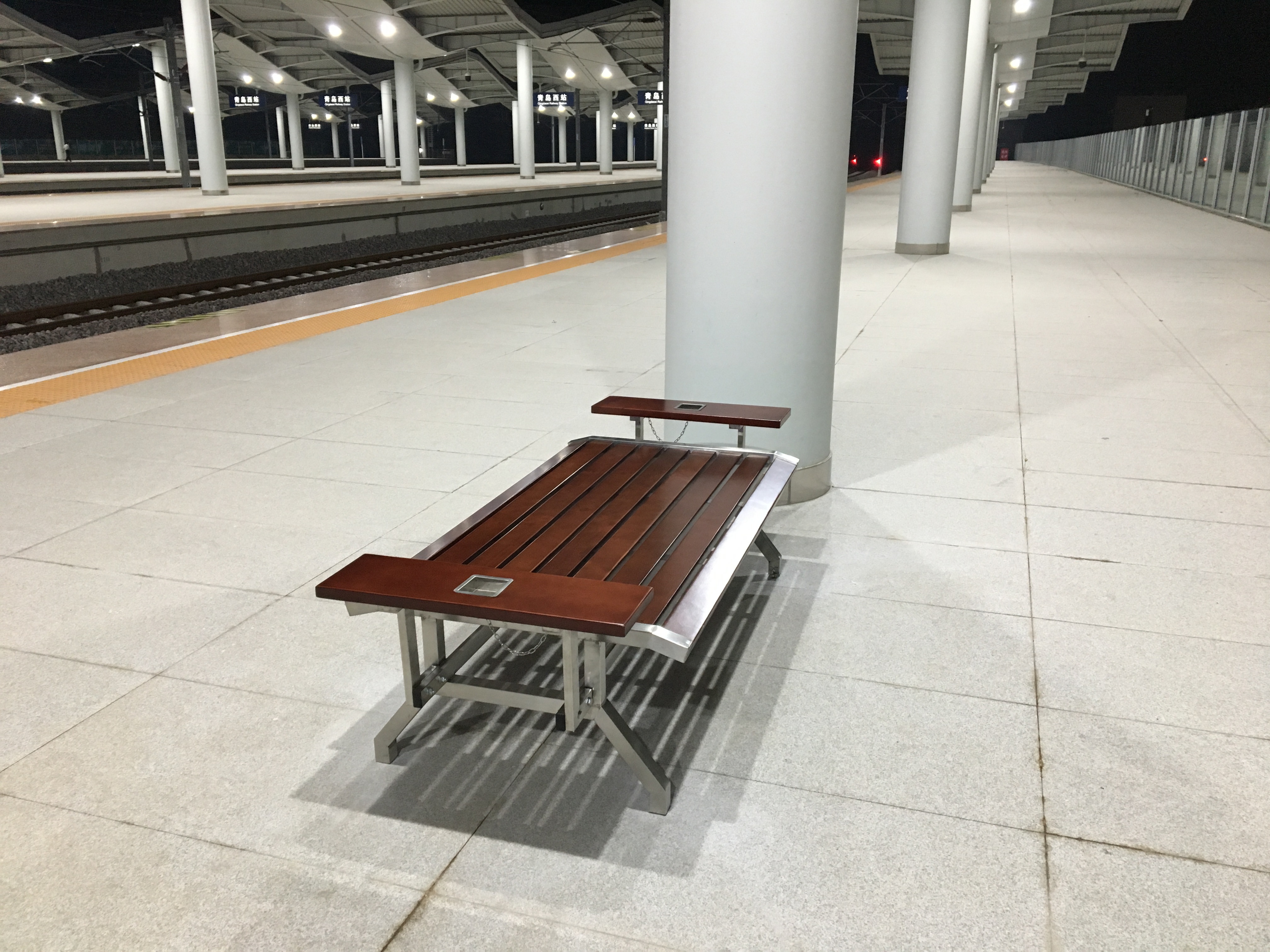 目前,青島西站使用中的站臺(tái)臺(tái)面共有4個(gè),在每個(gè)臺(tái)面分別安裝4套座椅,我們鑫金邦的同事用時(shí)2天將所有站臺(tái)不銹鋼椅子安裝完成。這款座椅支架由防銹不銹鋼支架制作而成,其他部位皆是木質(zhì)材質(zhì),外觀大氣、上檔次,左右手的帶不銹鋼煙灰缸的扶手更加體現(xiàn)了其人性化的設(shè)計(jì)。